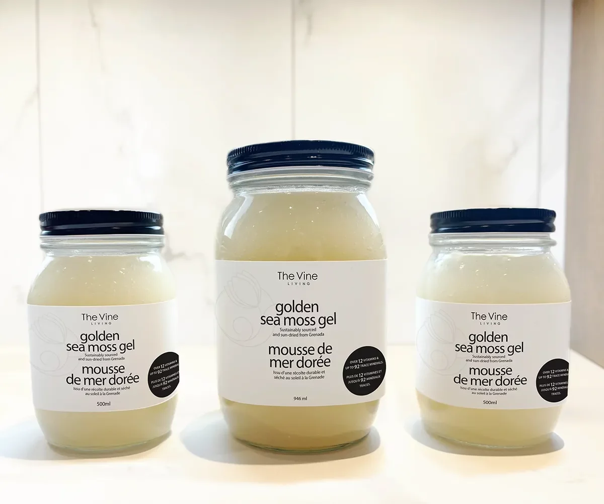 Elevate your daily wellness routine with The Vine Living’s Golden Sea Moss Gel—a premium, ready-to-use gold sea moss gel made from wildcrafted Irish sea moss sourced directly from the crystal-clear waters of Grenada and freshly prepared right here in Canada.